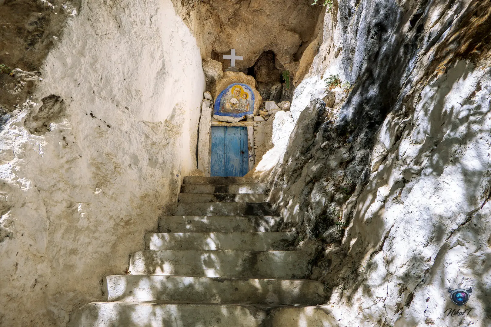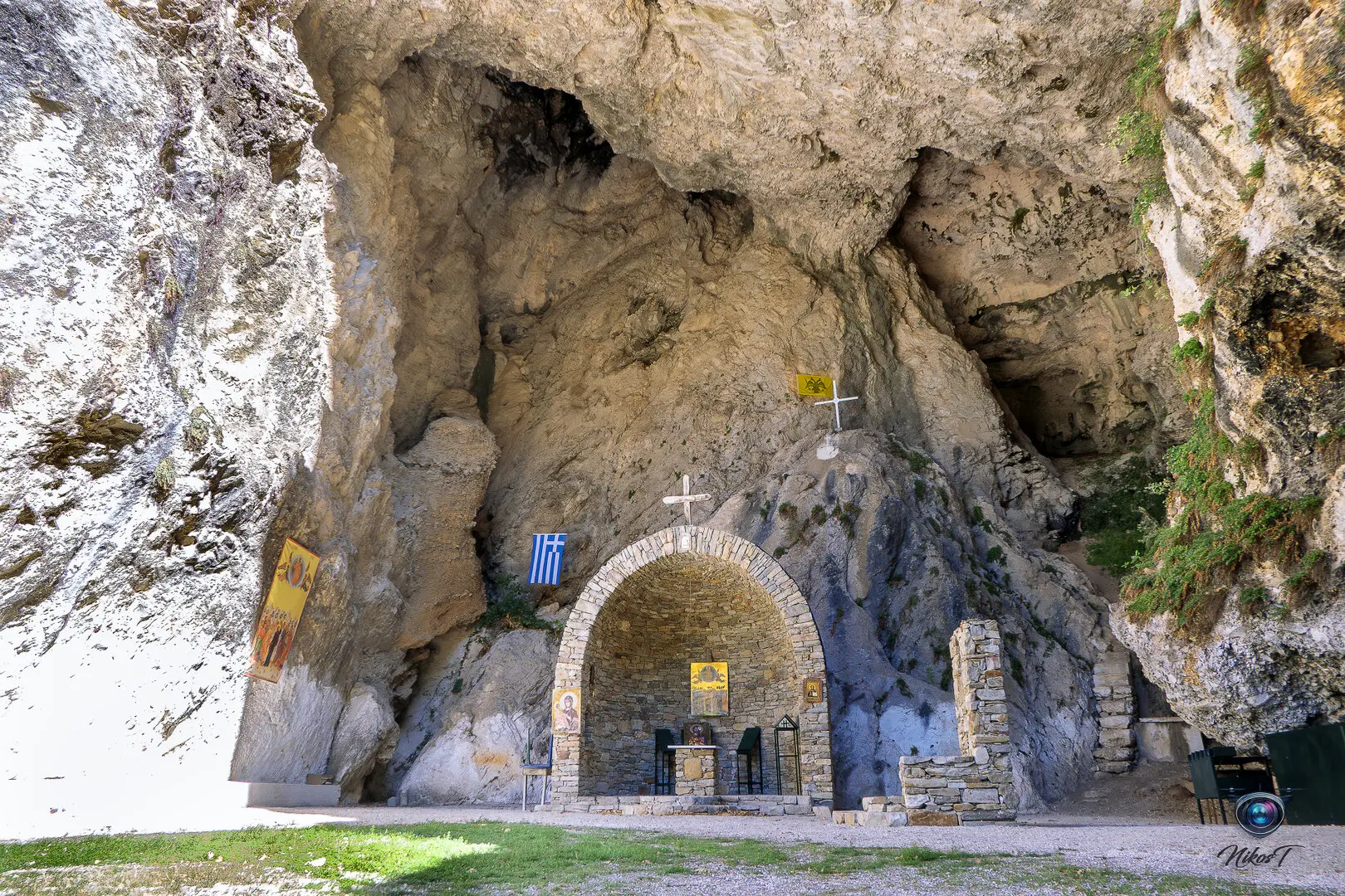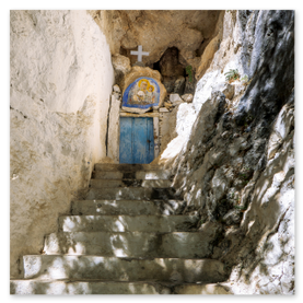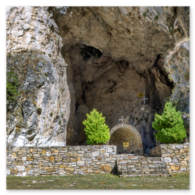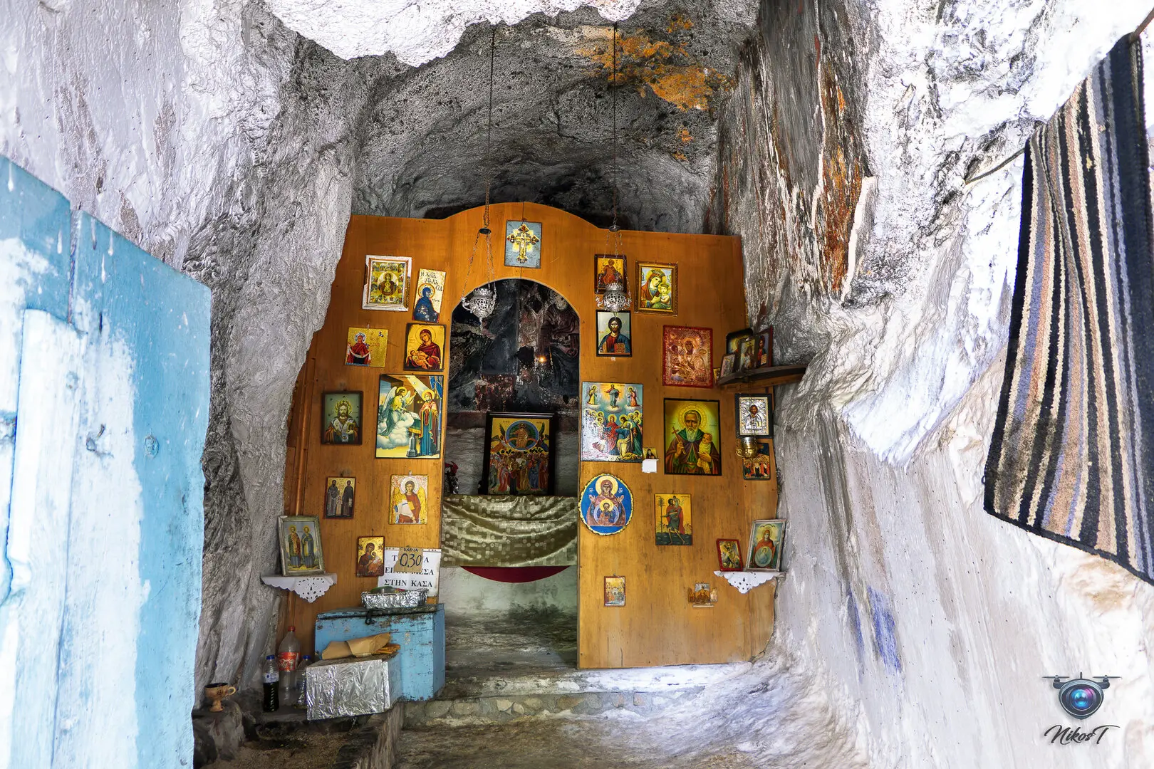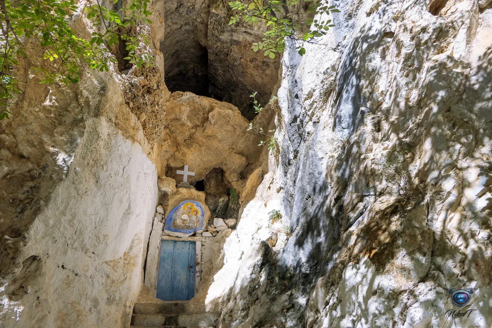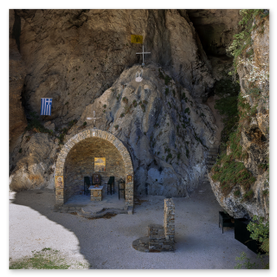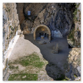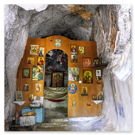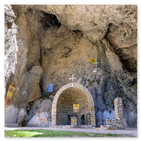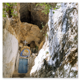 είσοδό του εντυπωσιάζει η εικόνα της Παναγίας που κρατά το Χριστό. Το σπήλαιο