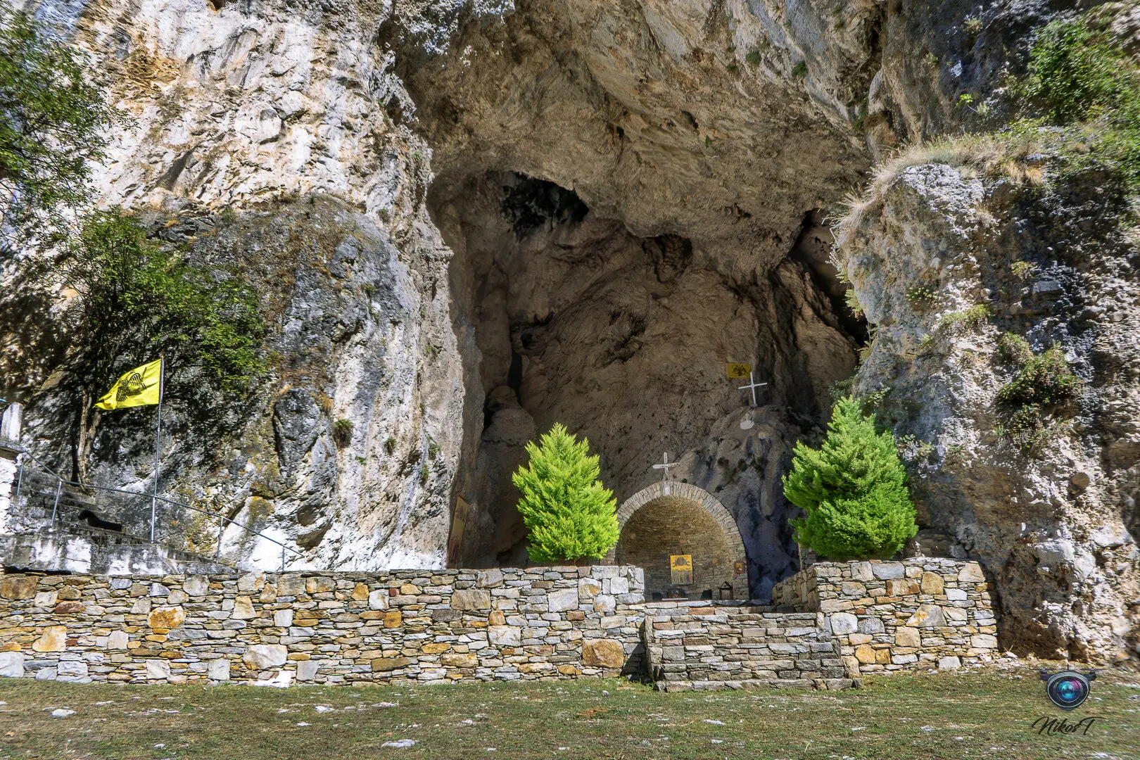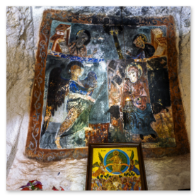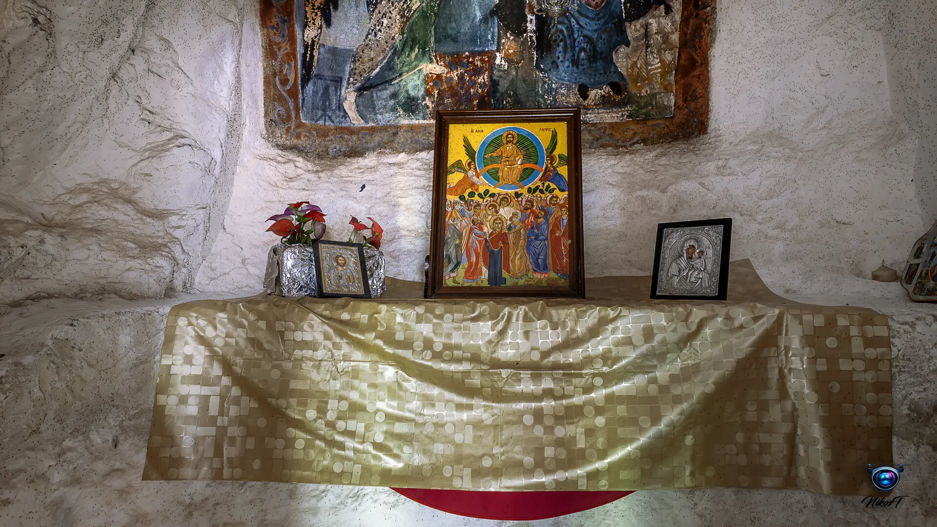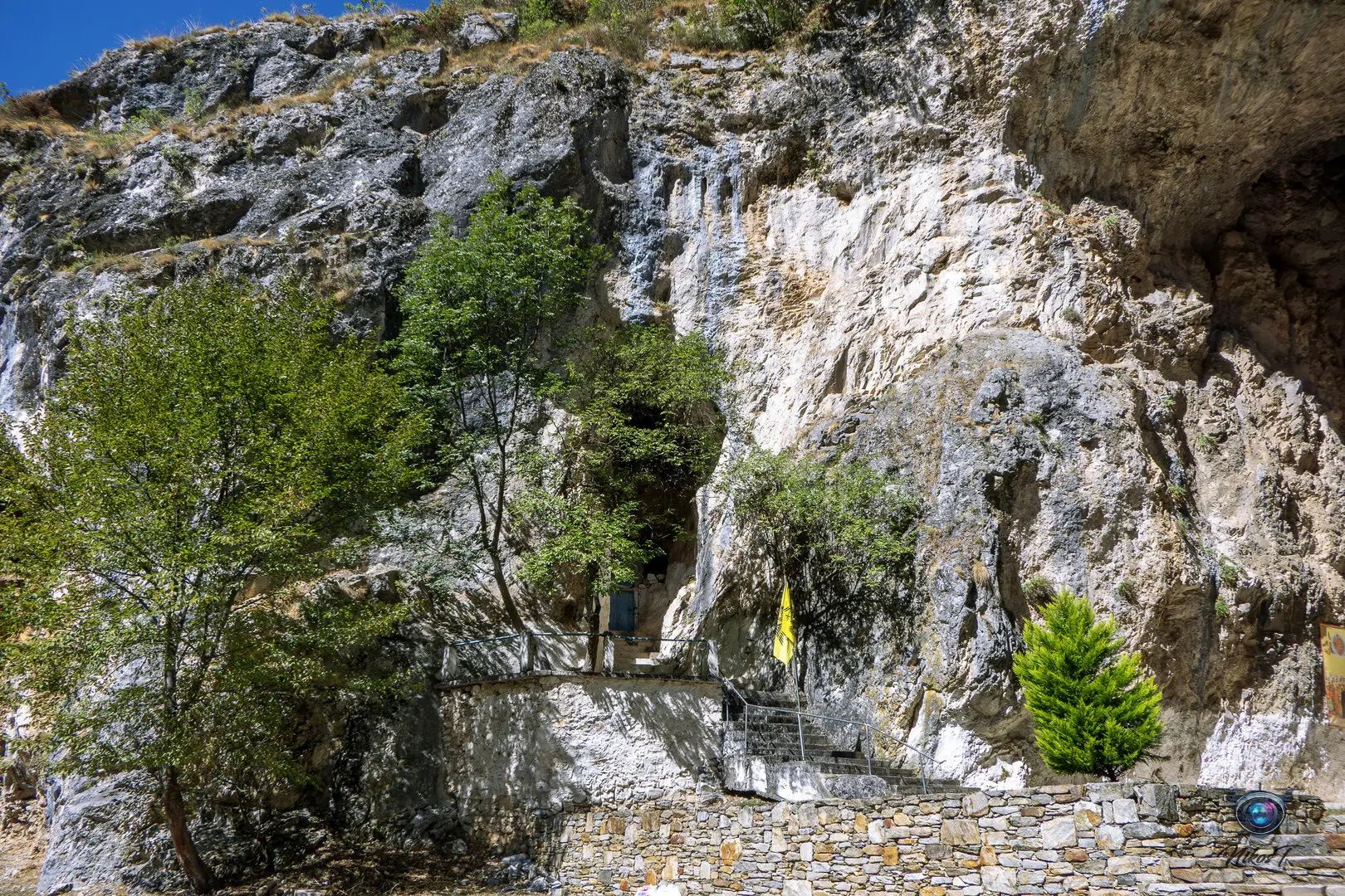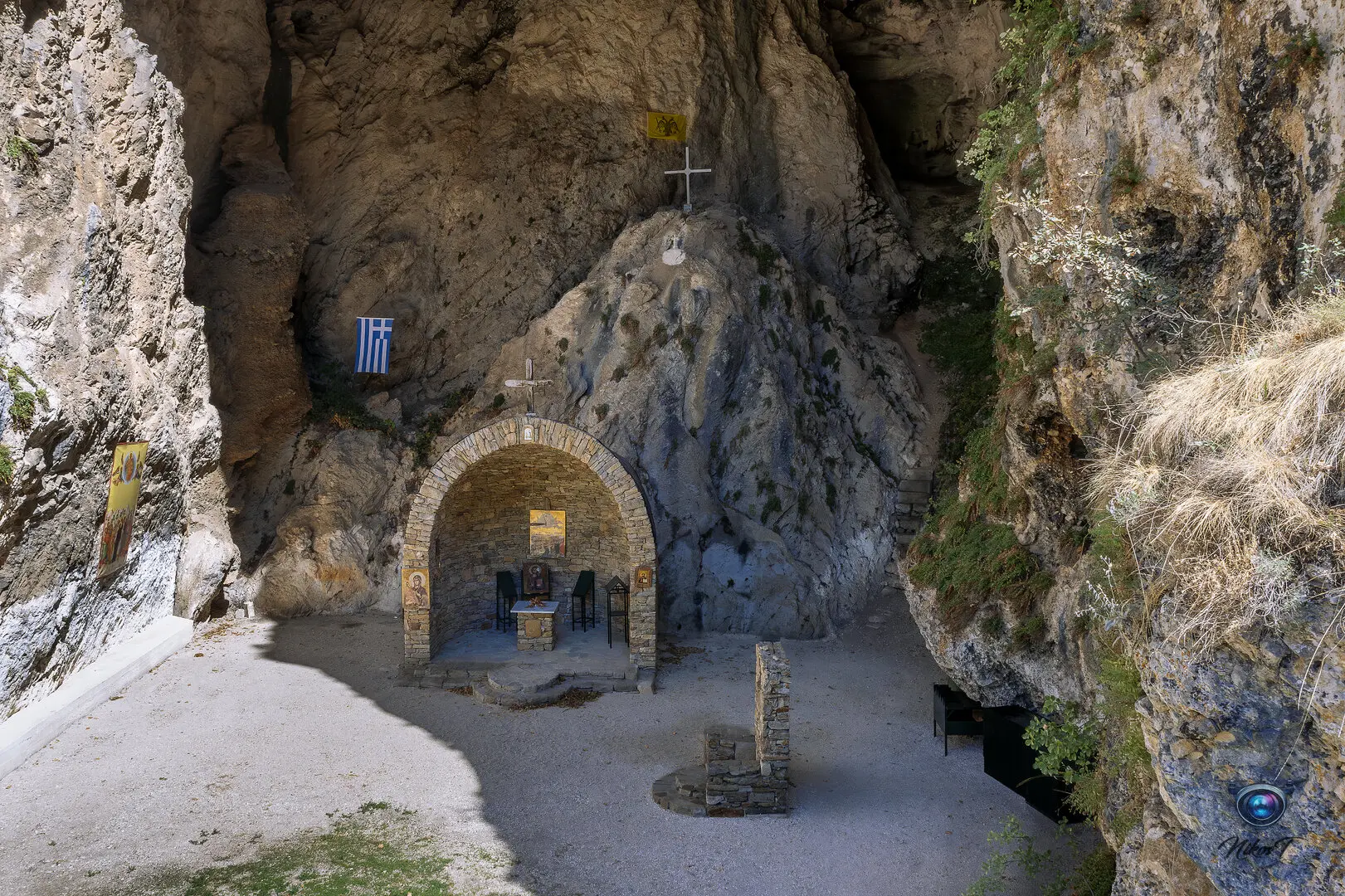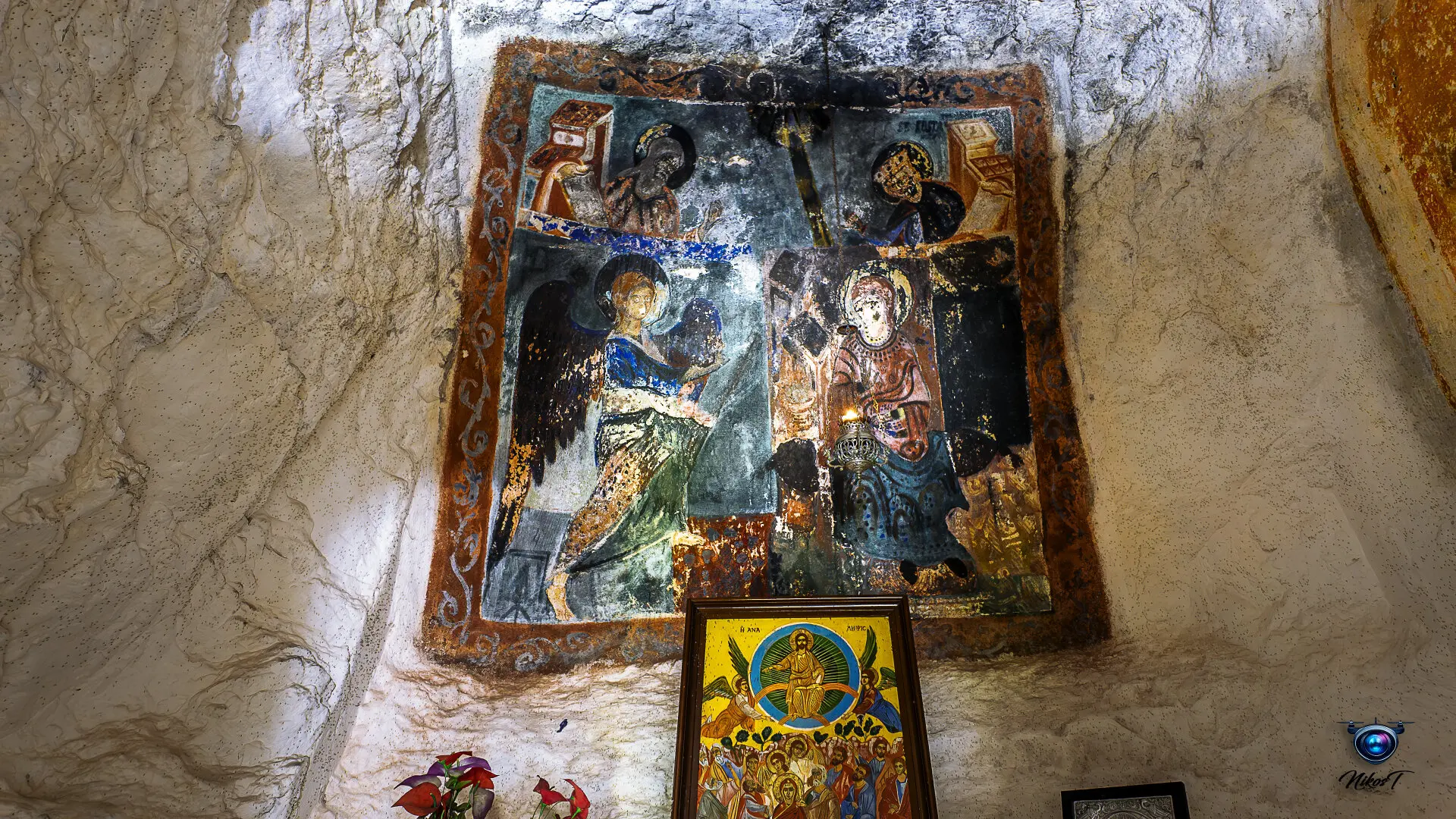 είσοδό του εντυπωσιάζει η εικόνα της Παναγίας που κρατά το Χριστό. Το σπήλαιο