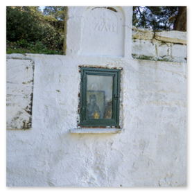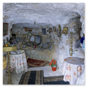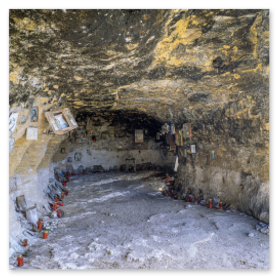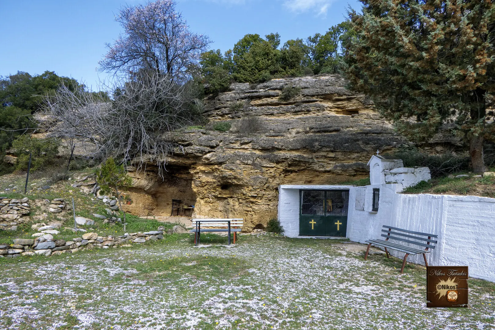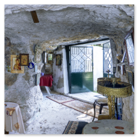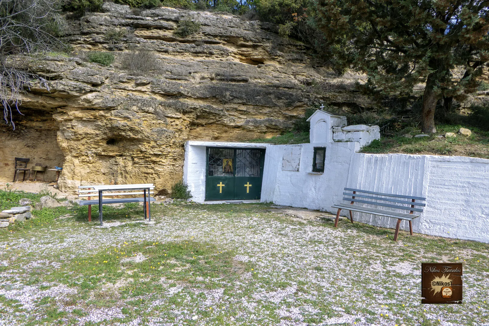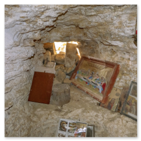 Η πρόσβαση γίνεται μέσω ήπιου μονοπατιού μέσα στη φύση. Καθώς ο επισκέπτης πλησιάζει, το τοπίο λειτουργεί ως φυσική προετοιμασία για τη μετάβαση από τον εξωτερικό κόσμο σε έναν χώρο εσωτερικής περισυλλογής. Η πέτρα, το λιγοστό φως και η απόλυτη ησυχία δημιουργούν μια αίσθηση αυθεντικής πνευματικότητας που δύσκολα περιγράφεται.