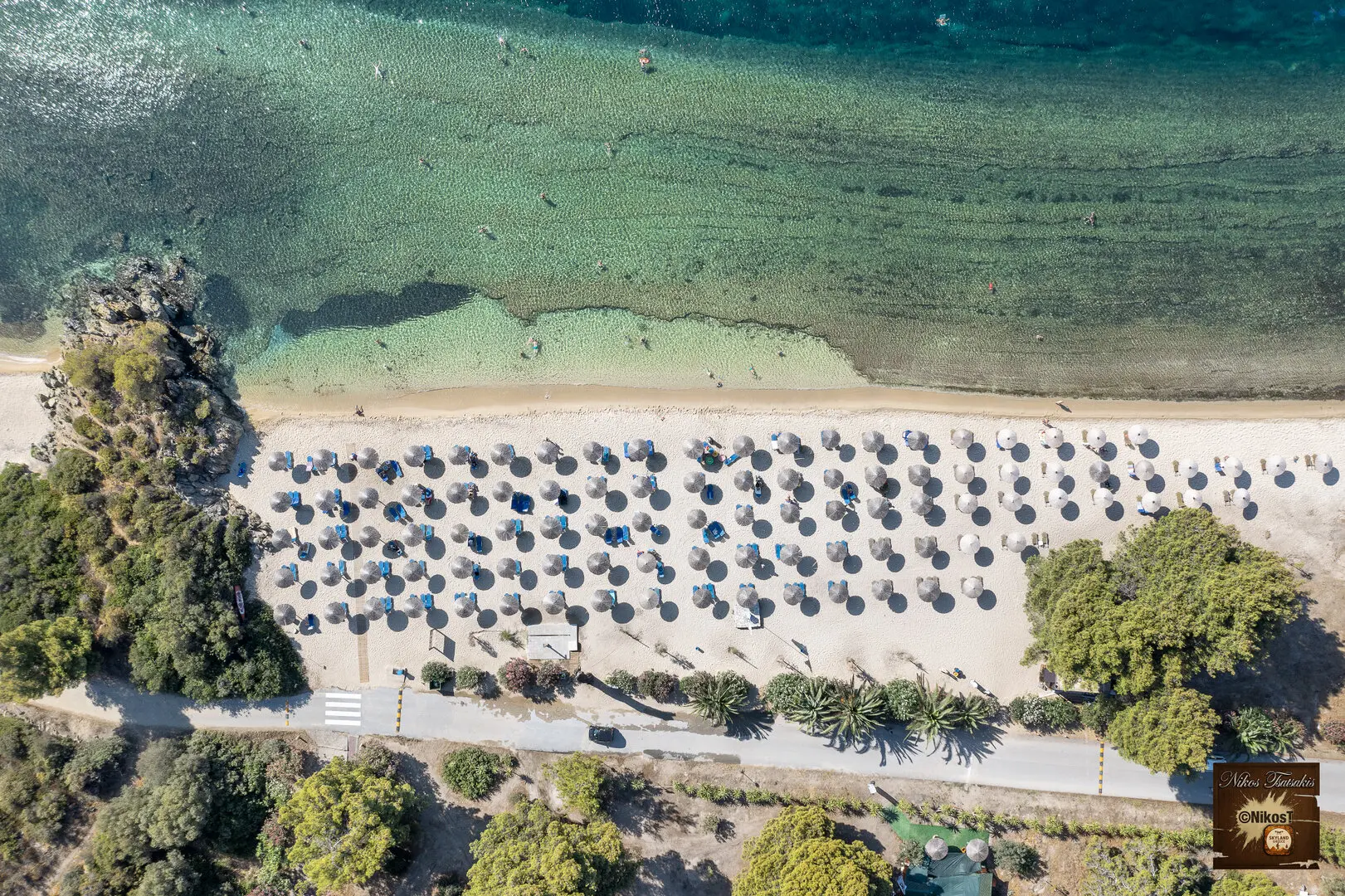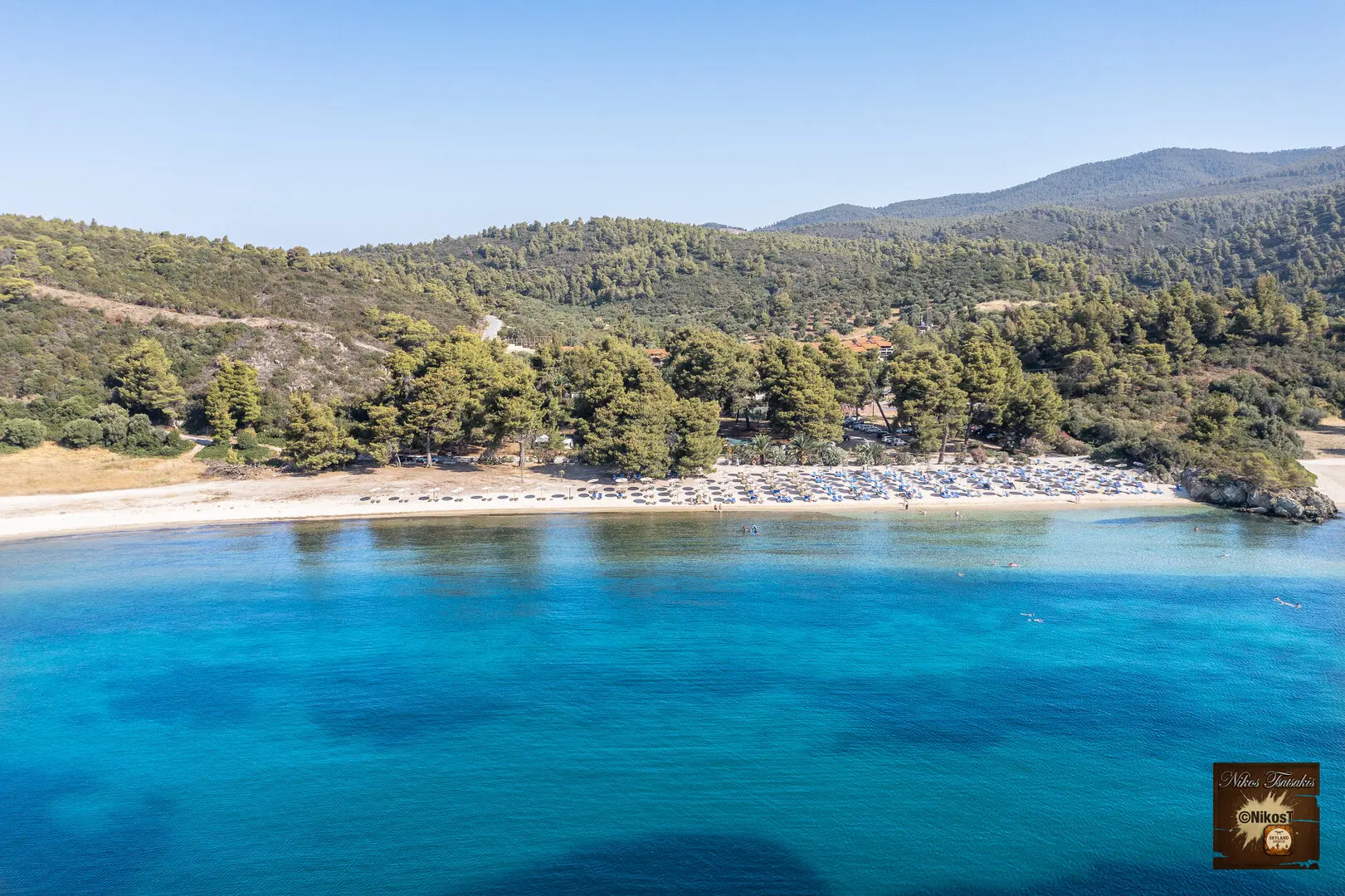 αμμουδιά και γαλαζοπράσινα νερά και ξεπροβάλλει μέσα από ένα καταπράσινο